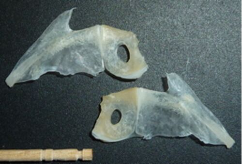 スズキ目スズキ亜目注ウミタナゴ科ウミタナゴ属 学名:Ditrema temminckii temminckii Bleeker 英名:Temminck's surfperch [原](但し「ウミタナゴ」1種とされていた時期の英名), Sea chub 青森県産の全長25cmの個体から摘出した左右の「魚のサカナ」の標…